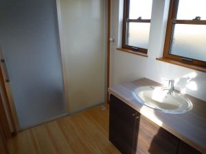 光の差し込む明るい洗面室は、木の温かみを感じるオリジナル洗面台で気持ちの良い1日がスタートできそうです。